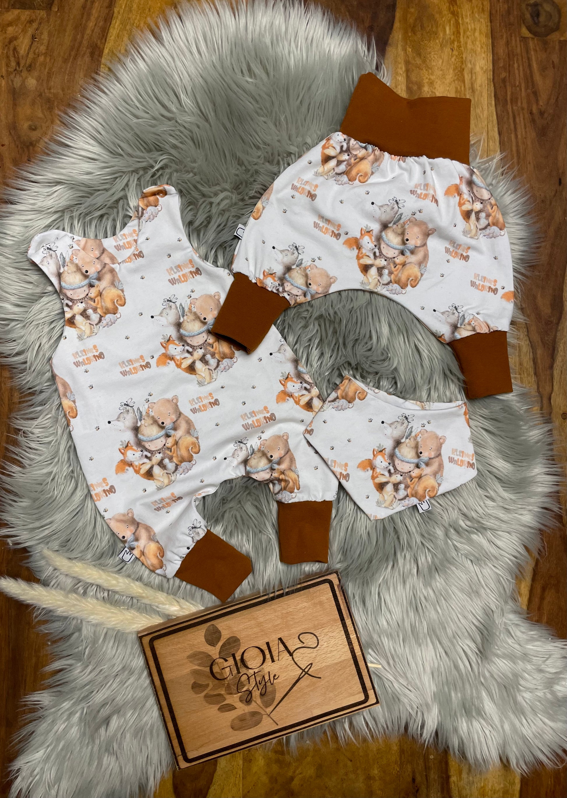 Größe: 56/62 Set aus Strampler, Pumphose und Dreieckstuch Kleines Waldkind