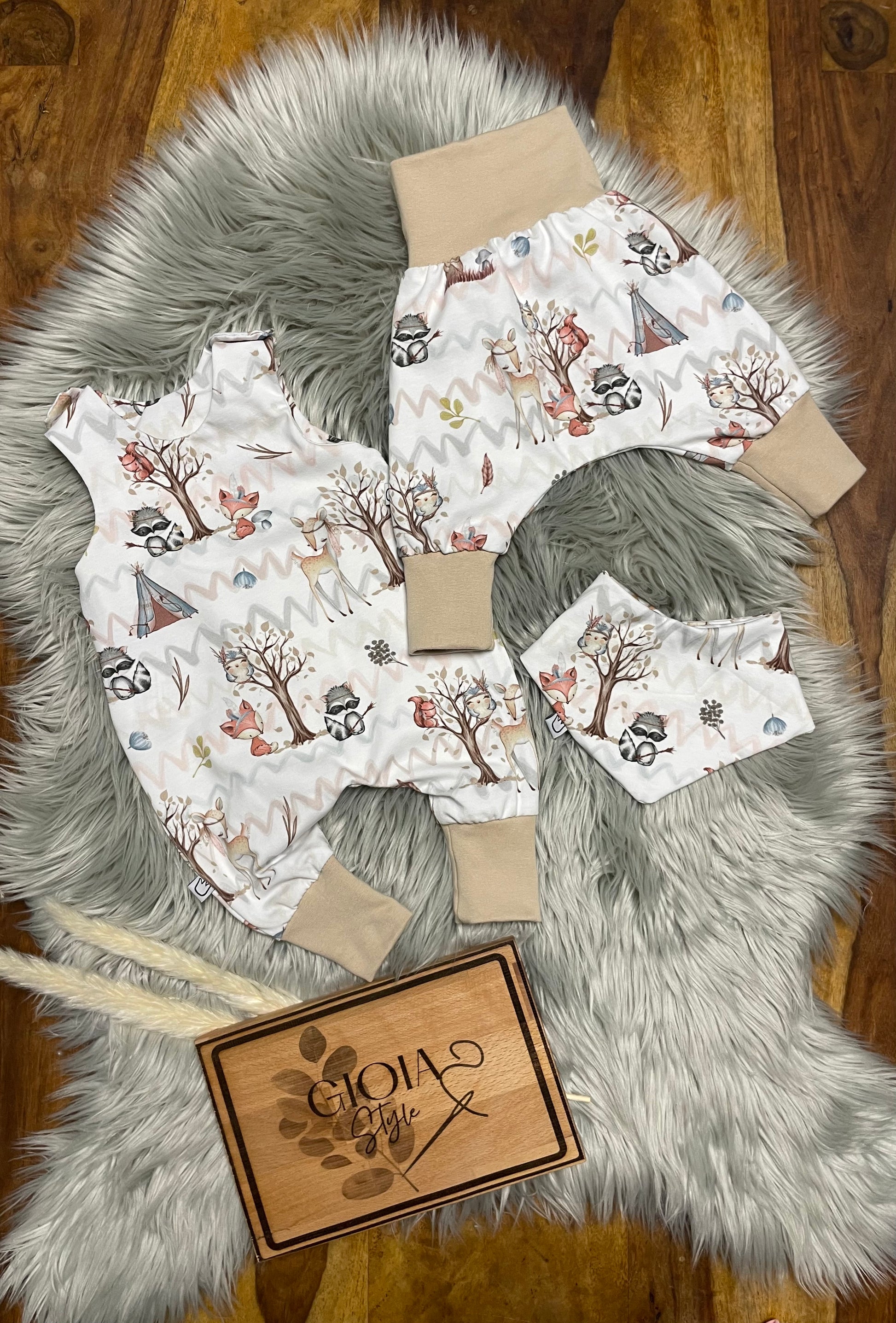 Größe: 56/62 Set aus Strampler, Pumphose und Dreieckstuch Waldtiere